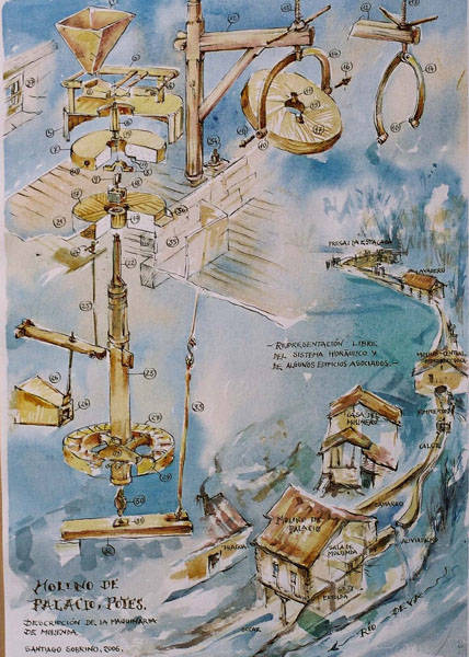 - Dibujo en acuarela describiendo la maquinaria de un molino hidráulico para la exposición “Paisajes y Tecnología del Agua” en el Monasterio de Rueda (Zaragoza 2008).