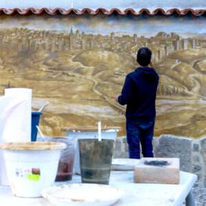 - Mural con una recreación de la vista de Madrid de Antón van den Wyngaerde (1562), en colaboración con Miguel Sobrino (Jardín del Almendro. Madrid, 2020).