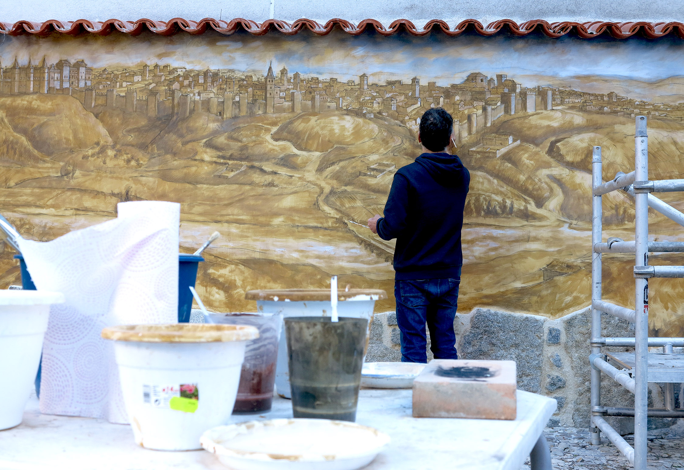 Mural con una recreación de la vista de Madrid de Antón van den Wyngaerde (1562), en colaboración con Miguel Sobrino (Jardín del Almendro. Madrid, 2020).